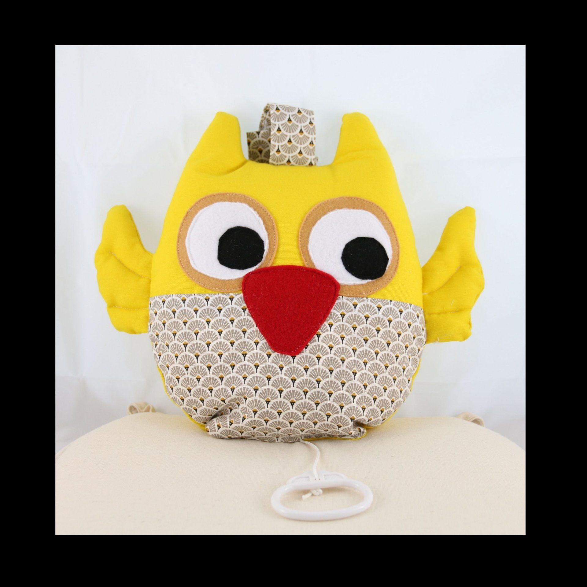 Voici les animaux musicaux tout droits sortis de la Fabrique Baudet Culotté Douce Baleine musicale, ou jolie chouette musicale , participeront à l'endormissement de votre tout petit ...la musique se fera entendre en tirant sur la petite poignée dessous. Avec sa languette velcros sur le haut, vous pourrez accrocher l'animal sur la poussette ou le lit de bébé Tout coton, rembourré à la ouate, entre 30 et 40 cm environ. 40 €